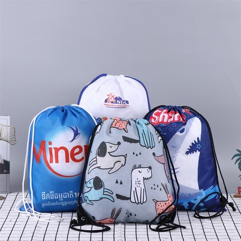 Bolsas de compras personalizadas, duraderas y baratas, 210D, nailon, cordón con logotipo personalizado, mochilas deportivas